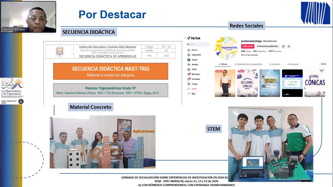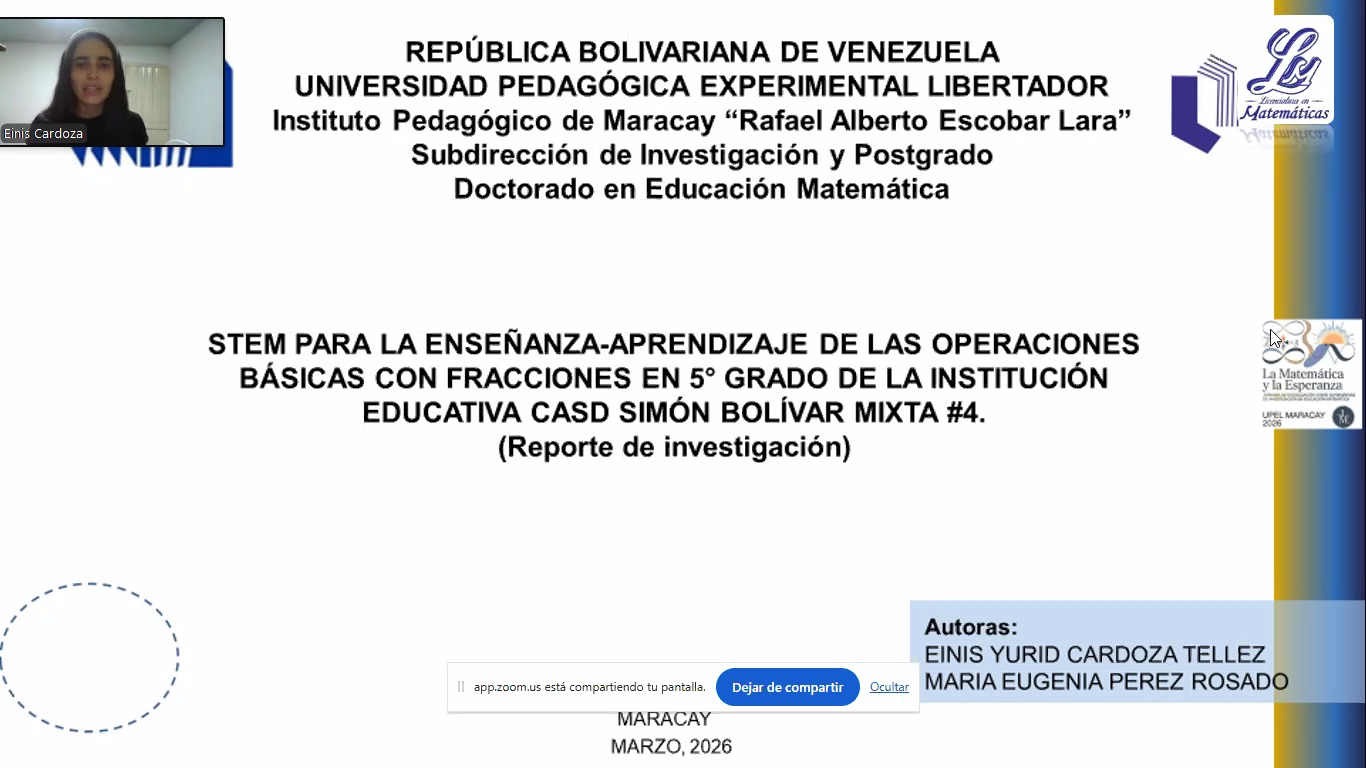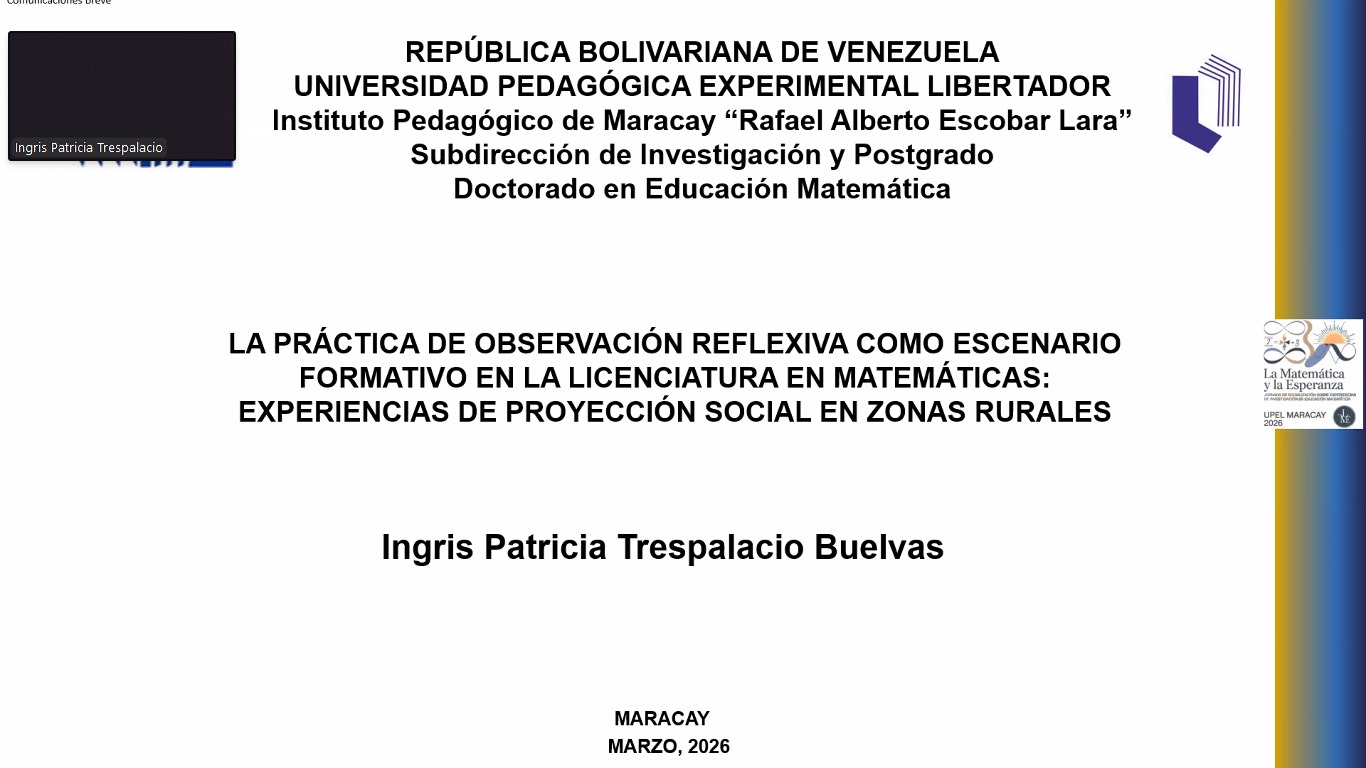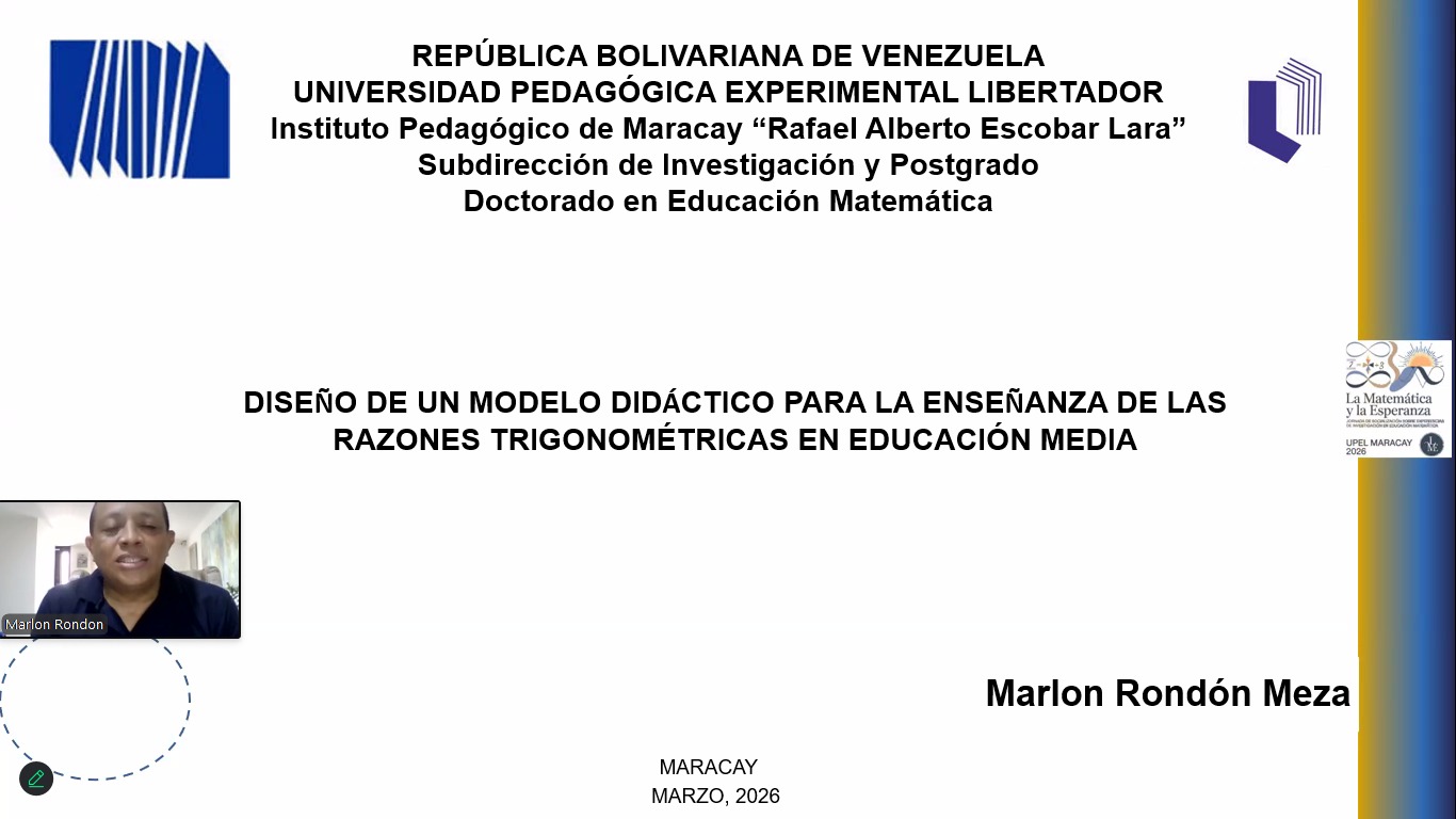 Entre el 12 y el 14 de marzo de 2026 se llevó a cabo el evento Jornada de Socialización de Experiencias en Investigación del Doctorado en Educación Matemática, organizado por la UPEL -MARACAY. En este evento hubo una destacada participación de los integrantes del